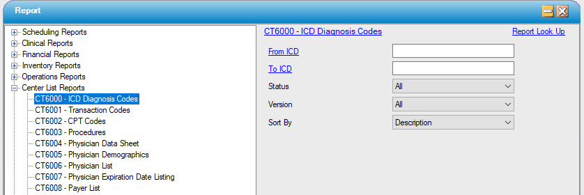 Track all ICD diagnosis codes entered into HST Practice Management. Reads directly off the ICD Diagnosis Code table (under Administration menu).