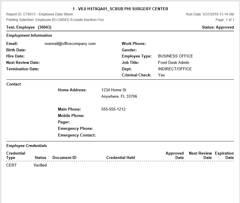 Employee Credentials: Displays the information for each Credential Type entered on the Credentials tab, including status, next review date, and expiration date.
