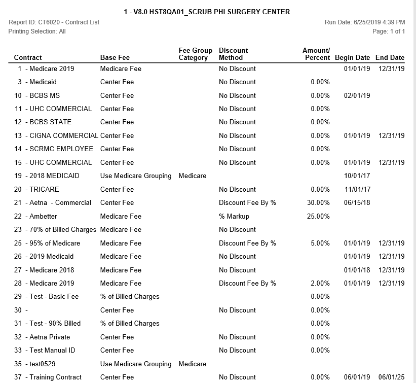 Summary list of payer contracts. Reads from Administration, Payer, Contract. Includes information on base fee, fee group category, discount method and effective dates.