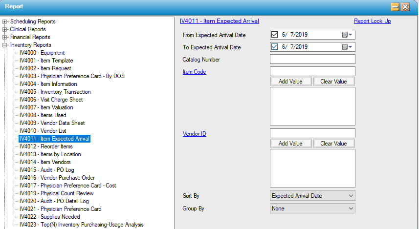 - Select item expected arrival date range, individual catalog number if tracking a specific item, individual Item Code(s), or specified Vendor ID(s).