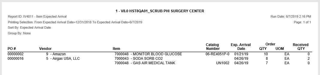 - Results can be grouped by expected arrival date, Item code or Vendor Name.
