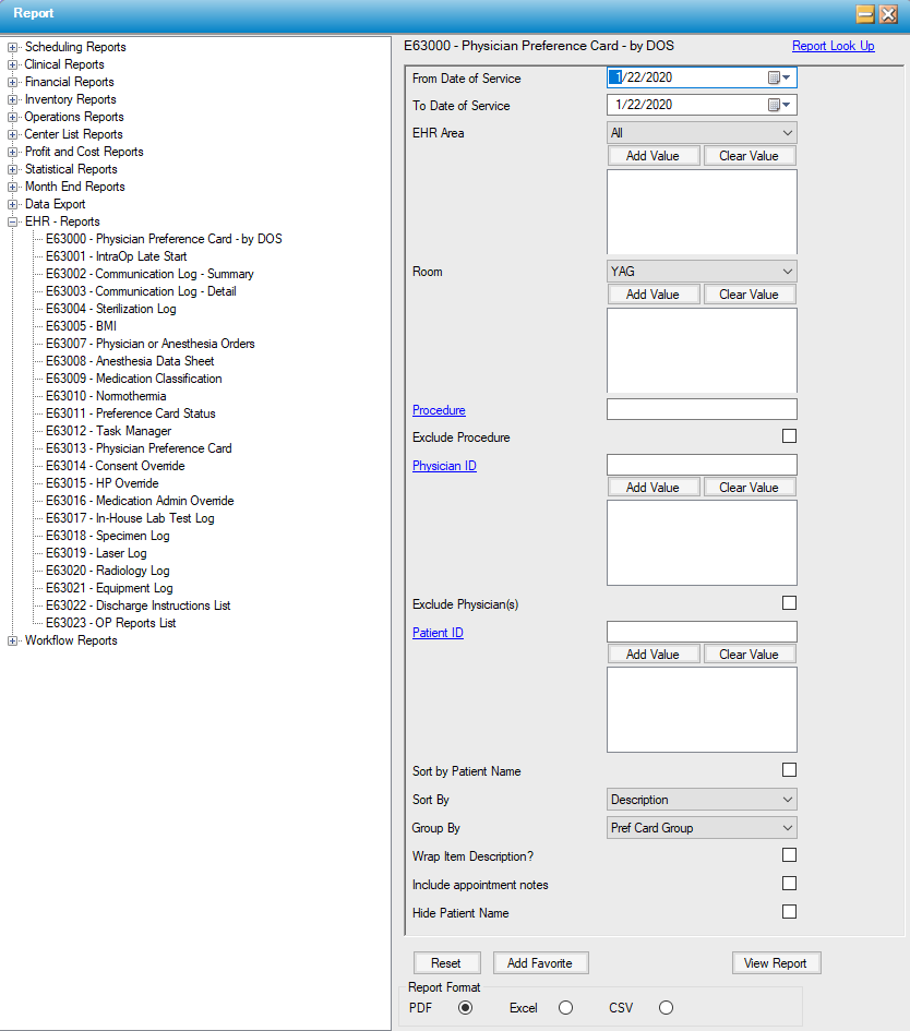 Optional filtering: Room, Procedure, Exclude Procedure, Physician ID, Exclude Physician(s), Patient ID