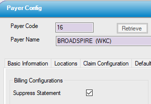 To prevent statements from generating for payers whose guidelines prohibit billing the patient, check the Suppress Statement box under Billing Configurations on the Other Configuration tab of Payer Configuration for those payers.