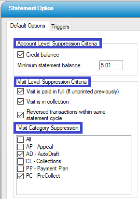 Statements can also be suppressed on an individual account level by checking the Statement Suppress box in the Statement Information tab in Billing > Patient Account.